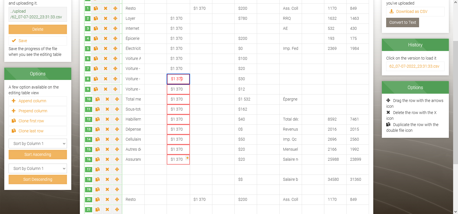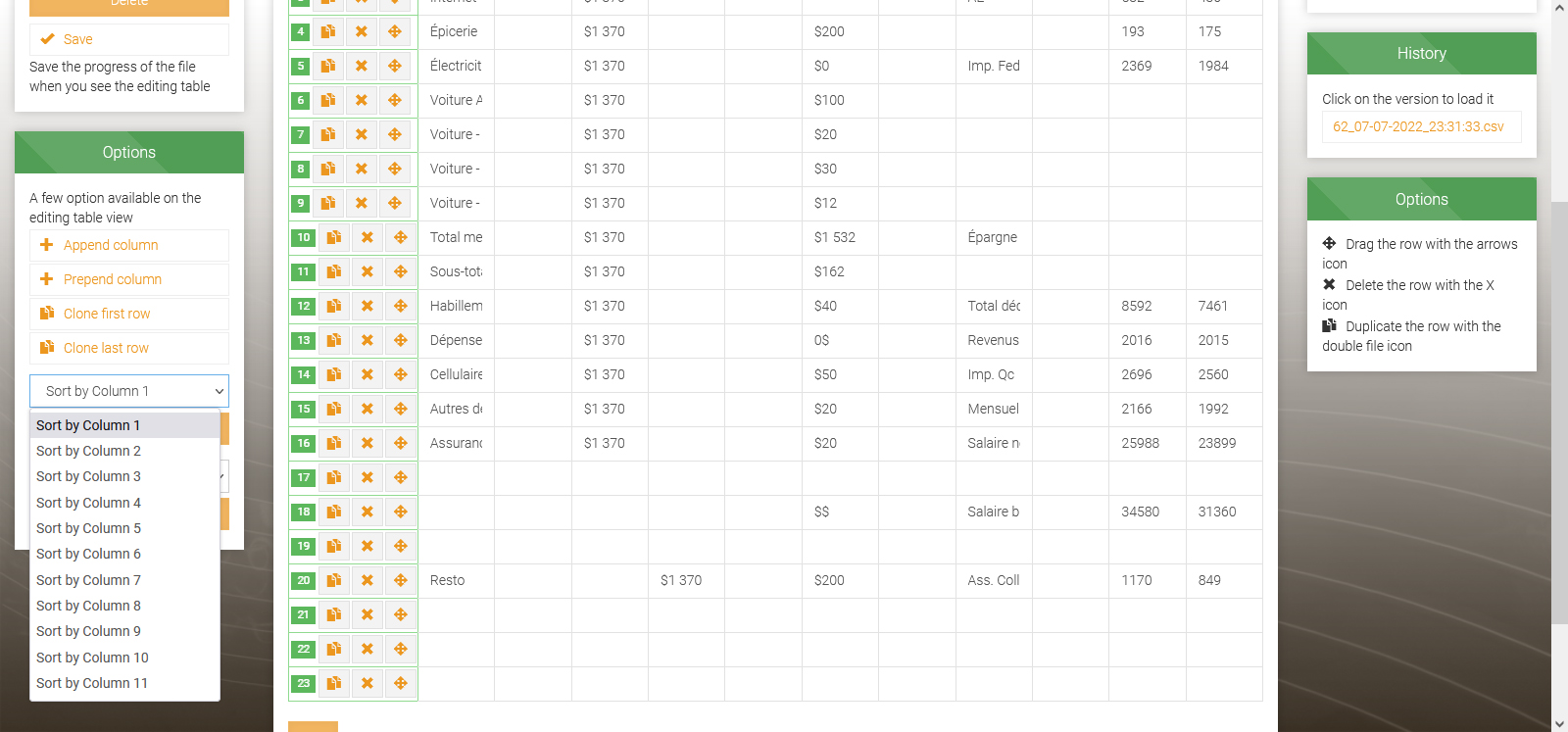 - New feature to click and drag rows column to reorder them